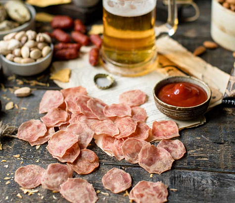 Классические мясные чипсы — это традиционная закуска к пиву, которая особенно популярна в Германии. Смесь черного и душистого перцев придает им особый аромат и вкус с легкой остротой. Мясные чипсы отлично сочетаются с дип-соусами: чесночным майонезом, горчицей или сметаной.