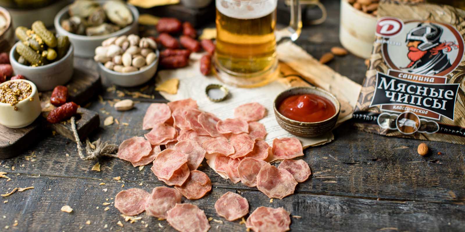 Классические мясные чипсы — это традиционная закуска к пиву, которая особенно популярна в Германии. Смесь черного и душистого перцев придает им особый аромат и вкус с легкой остротой. Мясные чипсы отлично сочетаются с дип-соусами: чесночным майонезом, горчицей или сметаной.